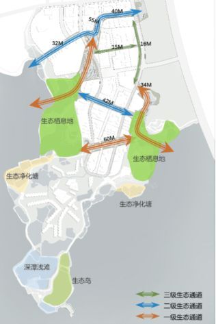 景观营造以健康城市理念为基础,并以排水体系为主要框架,遵从上位规划中周边用地的布局要求,自北向南由都市区、半都市区逐步过渡到自然区,构建人与自然和谐相处的生态的蓝绿空间。设计不仅将湿地片区留给丰富的动植物物种,还在廊道沿岸所有有条件的地方打造生态岛、浅滩、绿地等,尽可能给动植物留出充分的生存空间同时起到蓄洪作用,并给人们带来富有变化和趣味的空间体验,为半岛的生物多样性提供必要条件,努力打造健康环境、健康社区、健康出行的生态半岛。