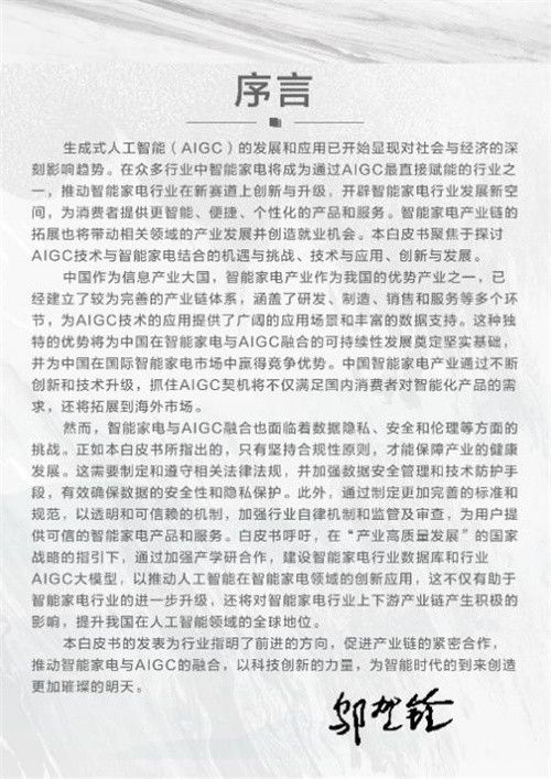 8月30日,国家高端智能化家用电器创新中心正式发布了《智能家电与生成式人工智能大模型创新与发展》白皮书,并联合海尔智家等参与编纂的头部企业,共同搭建面向智能家电产业的国产大模型开放平台,以推动AIGC技术的应用和突破,为用户提供更智能、便捷和个性化的体验。