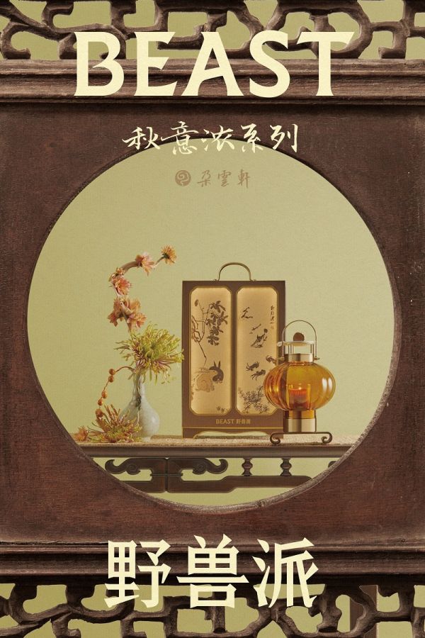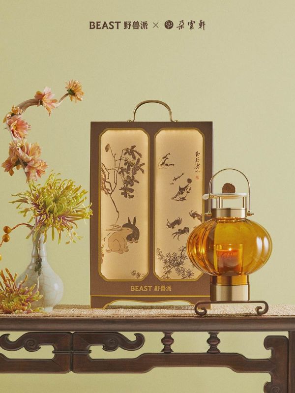 此次“秋意浓”系列中,野兽派特别推出了两款别出心裁的中秋礼盒。第一款礼盒,金秋暖香炉,以古代提箱造型为灵感,缀以双扇描金花窗,左窗为《桂花双兔》,金桂点点,双兔傍地走,代表团圆美好;右窗为《鱼蟹图》,是秋日的水生世界,代表盎然生机。向上提拉,打开礼盒,一盏秋日暖香炉,静待君启,它像是暮光中渐显的圆月,为归家之人,洒下月辉。搭配的蜡烛是野兽派秋季新香生命之木,代表深沉坚实的内在力量,向上生长,向下扎根。