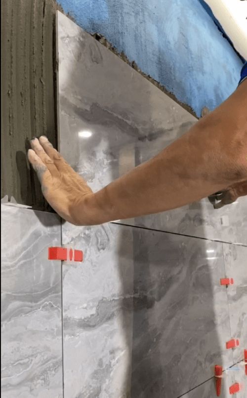 在规定的施工时间内(1小时)将瓷砖贴在墙面或地面上,最后再进行揉压调整。