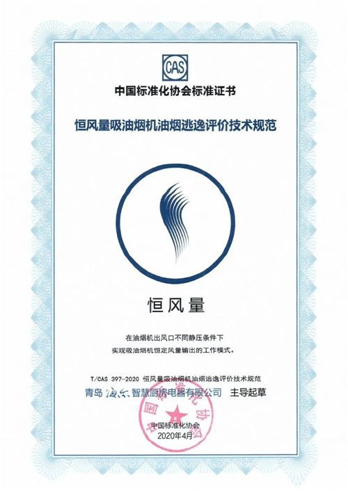 ◆ 标准:主导制定了《恒风量吸油烟机油烟逃逸性能技术规范》。