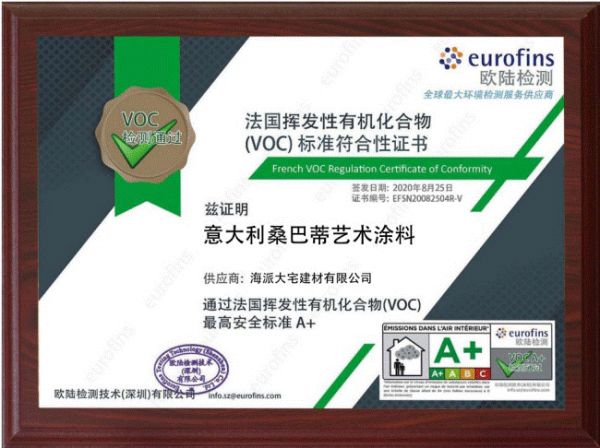 作为一家注重环保的品牌,桑巴蒂艺术涂料从创立之初就致力于绿色环保理念的推广。公司严格执行环保政策,选用低挥发性有机化合物的原料和生产工艺,确保产品不含甲醛等有害物质。此外,桑巴蒂艺术涂料还获得了多项环保认证,如“质量管理体系认证证书”“法国VOC检测A+认证”等,充分展示了其在环保方面的决心和能力。