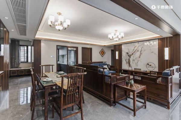 这是一套135㎡的四居室中式,刘胤根据屋主喜好将古典与现代手法相结合,运用对称、留白及色彩的表达,让简约的空间有了东方神韵,让传统与时尚达成了美学上的平衡。在现代手法中融入中式元素:大气的回型吊顶搭配岩板拼接木饰面电视墙,极具典雅古韵;全房柜体、家具色系相协,古朴的中式造型,完美呈现东方意境。