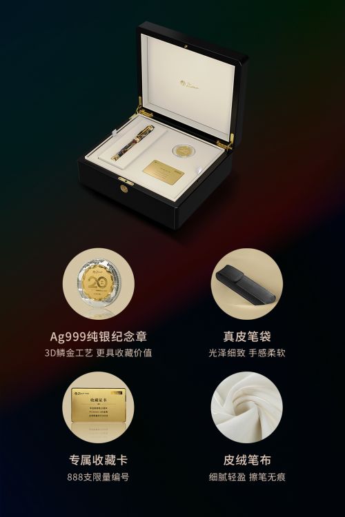 这款全球限量的辉煌系列金笔还拥有特别的臻享礼盒,并特别定制了Ag999纯银纪念章、真皮笔袋、专属收藏卡和皮绒笔布等。臻享礼盒简约而高贵的风格设计,无论用于个人收藏还是高端馈赠皆是上佳之选。