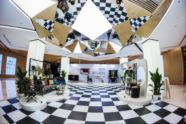 步入展览,映入眼前的是一片富有戏剧感的生活空间,黑白棋盘格地面向舞台延伸,营造视觉张力;方正的结构彰显舒展敞亮之感,视野开阔,也为功能布局提供灵活度。