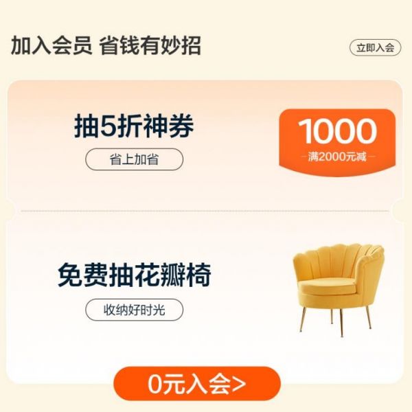 既然是“超省日”,那就要将省钱进行到底。全友推出0元入会活动,活动期间内成为全友京东官方旗舰店会员,即可抽取满2000元减1000元的5折神券,还有机会获得免费花瓣椅。