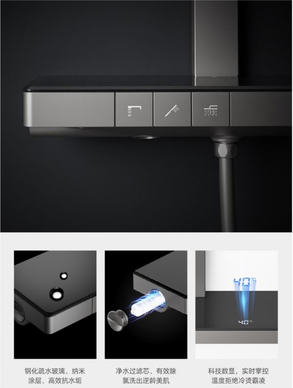 40cm超大置物平台设计让您的家中洗浴用品都能轻松放置,不再担心洗漱用品摆放空间不够的问题。而独特的钢琴按键操作,也让您能够简单而直观地控制多模式水流输出,一切尽在掌握。