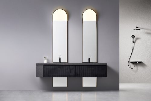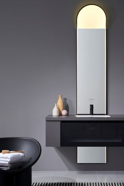 Lenno 朗诺空间以高品质材质融入精工工艺。高端的岩板台面搭配多层实木生态板柜身,主柜抽面5mm艺术玻璃贴,更兼备金属边框,材料与色彩的碰撞衔接,丰富了浴室的空间层次感,赋予了艺术的张力。