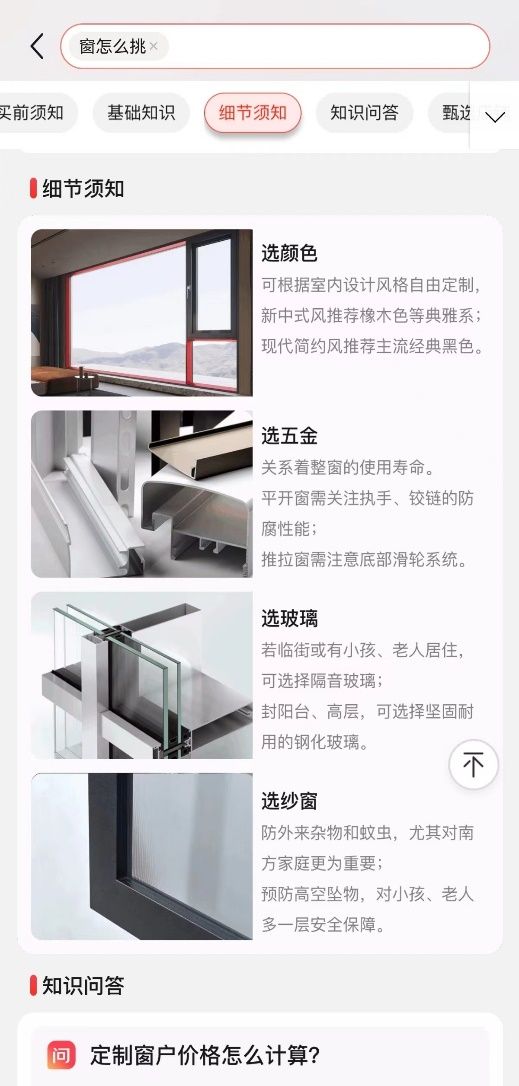 为了帮助消费者更快捷地选购到优质门窗,京东还同步推出《京东门窗选购指南》,辅助购买决策。消费者在京东App搜索“窗”,即可点击“窗怎么挑”进入选购导览,从门窗基础知识、细节须知、知识问答等科普资讯,到甄选店铺、种草推荐带来的优选好物,轻松实现“闭眼买”。