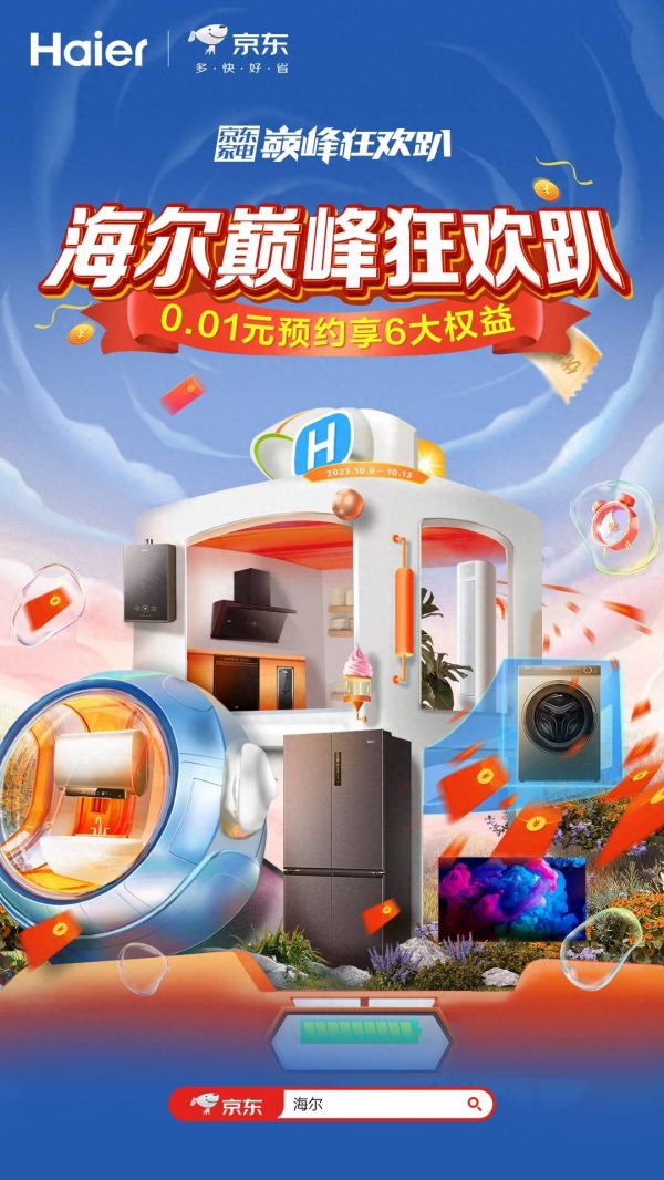 与线下探厂直播活动同步,海尔智家联合京东同步于2023年10月12日晚八点-13日在线上开启巅峰狂欢趴活动,消费者能够获取至高1400元以旧换新补贴,同时还有0.01元预约享6大权益等多重福利。据悉,海尔智家2023年推出的重磅爆款产品,包括全空间保鲜零距离嵌入冰箱、精华洗超薄平嵌洗衣机、五重净化恒温新风空调、小魔盒纤薄双胆热水器、风冷鲜冻国瓷系列冷柜、平嵌大师系列烟灶、75英寸小超跑智慧屏电视、健康双面洗洗碗机以及海尔鲜活水净水器等全系家电在内的爆品均将参与本次巅峰狂欢趴活动。