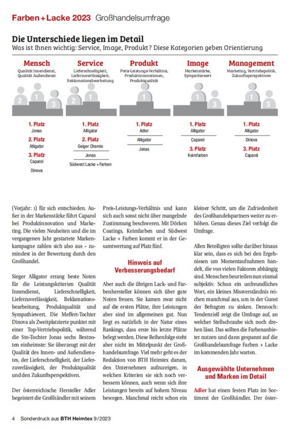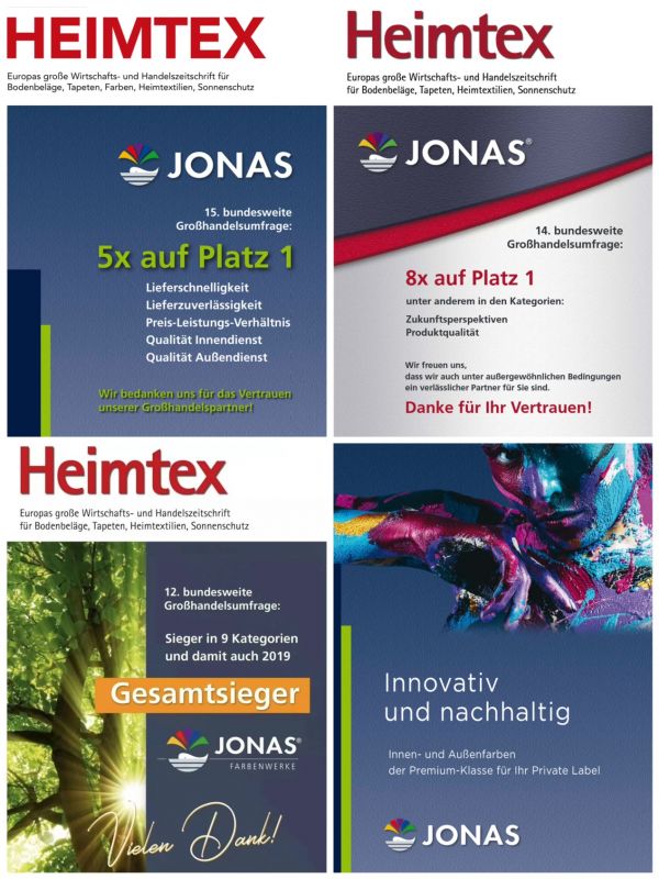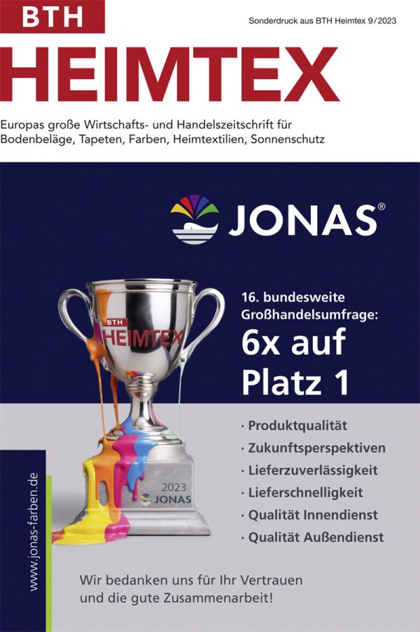 权威家居产品杂志BTH《Heimtex》于2023年7月进行了对德国市场上最具代表性的知名涂料品牌进行了书面调查,并进行了1(非常好)-5(不足) 之间的评分。调查研究显示,今年JONAS鲸彩漆包揽了13项测评项目中的6项标准第一名。