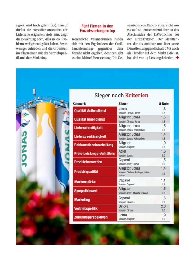 JONAS鲸彩漆在产品质量、供应可靠性、交货速度、内部服务质量、对外服务质量、未来前景的六项评比中均取得最高评价,鲸彩漆以2.0的整体评分位居德国涂料行业顶端,再次彰显了JONAS的标杆地位。
