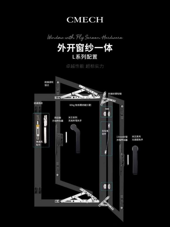以CMECH希美克外开窗五金系统为例,整套门窗五金系统在性能上进行了提升了优化,比普通的门窗五金系统更稳定更安全耐用。