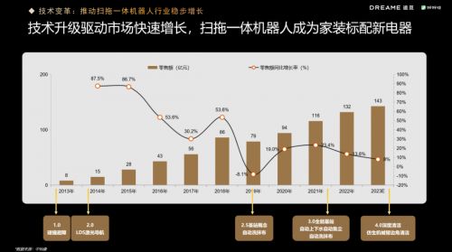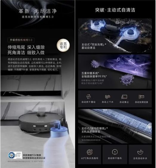 白皮书提到,目前扫拖机器人经历了多代技术升级,其中包含了1.0碰撞避障、2.0 LDS激光导航、2.5基站概念自动洗抹布、3.0全能基站,并且已在2023年5月实现了4.0深度清洁的迭代,也就是追觅首创的仿生机械臂边角清洁技术,进一步解决了家庭清洁中的卫生死角问题。