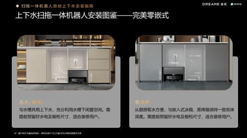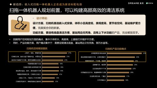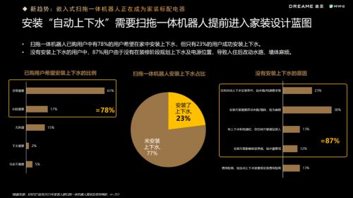 与此同时,随着用户接受度的逐渐走高,扫拖一体机器人也逐渐被认可作为家庭标配新电器进入到家庭。数据表明,已有95%的受访者在装修时关注扫拖一体机器人的选购、位置和安装。随之而来的一系列问题却亟待解决,其中安装“自动上下水”这一环节,就存在「78%用户希望安装」与「只有23%用户成功安装」的矛盾以及「87%用户由于没有提前规划导致入住改动麻烦」的问题。这也意味着,扫拖一体机器人需要提前进入家装设计蓝图,厂商需提前作出准备。