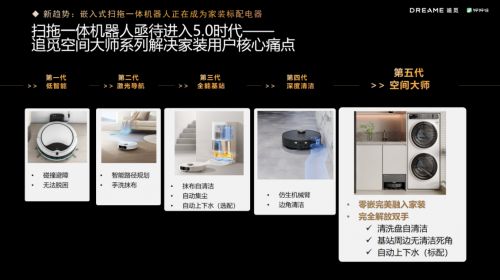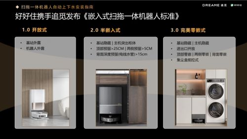 好好住和追觅在白皮书中对嵌入式扫拖一体机器人制订了全新的标准,旨在推动行业健康有序发展。我们认知之中传统的扫拖一体机器人和基站均外露的设计,被定义为1.0开放式;开始追求基站隐藏,但主机仍突出柜体、需大量预留空间的设计,则被定义为2.0半嵌入式;而追觅空间大师 Master 系列则是实现了基站和主机的全隐藏,仅有进出口开放,同时机体顶部、两侧和背部都实现了零嵌,这便是3.0完美零嵌式设计。