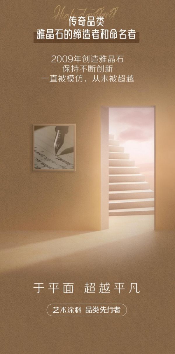 雅晶石艺术涂料的成功之处在于其独特的创新设计。首先,其创新的命名使其与众不同,为品牌塑造了和其他产品区分开的个性,并在众多产品中脱颖而出。雅晶石命名灵感源自于精细的矿石质感和晶莹剔透的效果,准确地传递了产品的特点。这种独特的命名不仅让消费者对产品产生了好奇心,也使其更容易被记住和辨识,进而建立了稳定的品牌认知度。