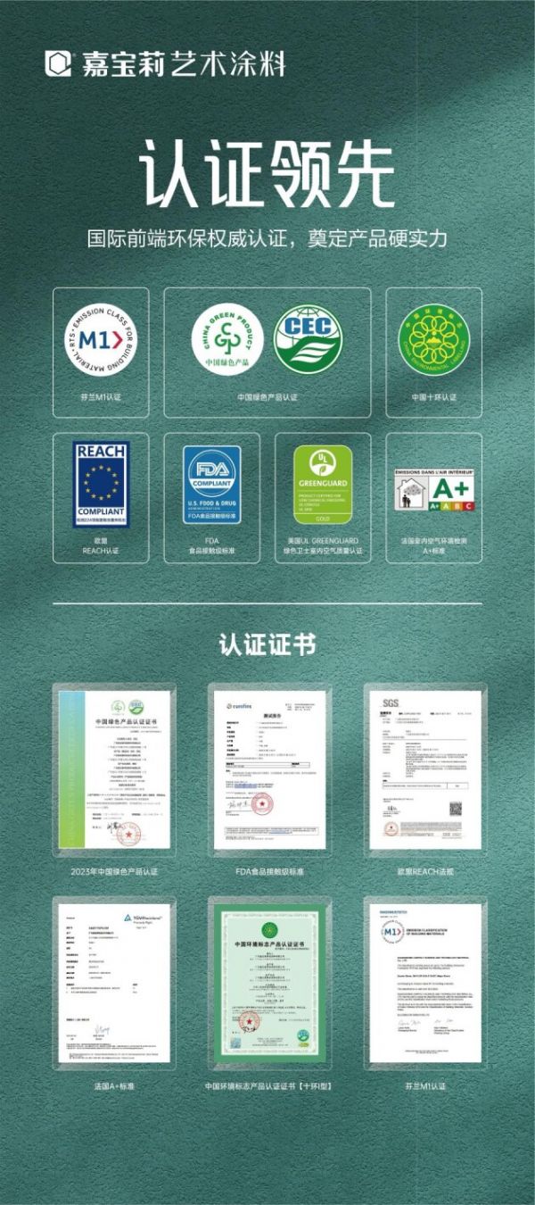嘉宝莉艺术涂料《先行,也是领先》宣传片,也强调其在环保认证方面的优势。雅晶石艺术涂料通过多个国内外认证机构的严格审核,包括芬兰M1认证、法国A+认证、中国绿色产品认证和十环认证等。这些认证证明了嘉宝莉艺术涂料雅晶石在环保方面的卓越表现。