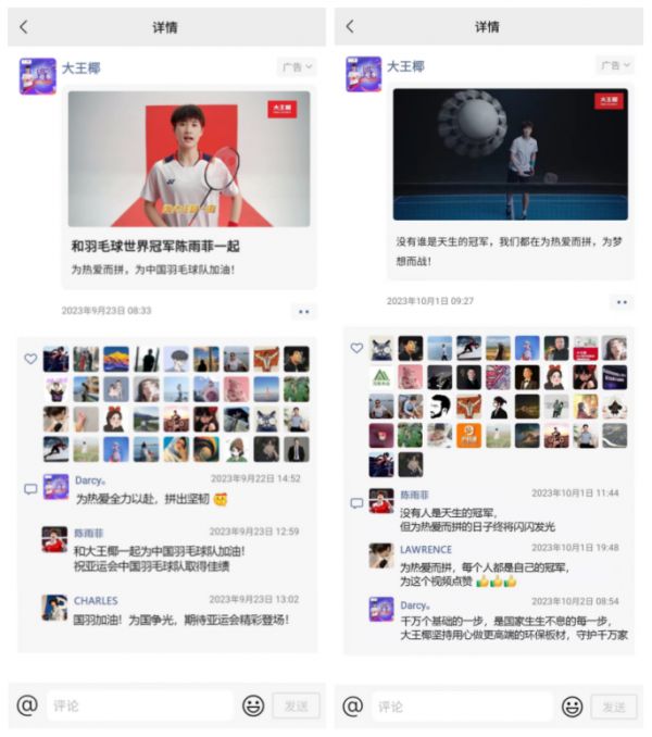 大王椰作为中国国家羽毛球队官方板材供应商,精准洞察到全民运动的时代趋势和健康生活的精神价值,通过打情感牌进行品牌宣传。在9—10月展开“国庆热爱季”的营销活动,一度将话题推向新的高度,在收获广大消费者情感共鸣、释放情绪的同时,也极大程度上加深了消费者对大王椰“热爱季”的认可度和黏贴性。