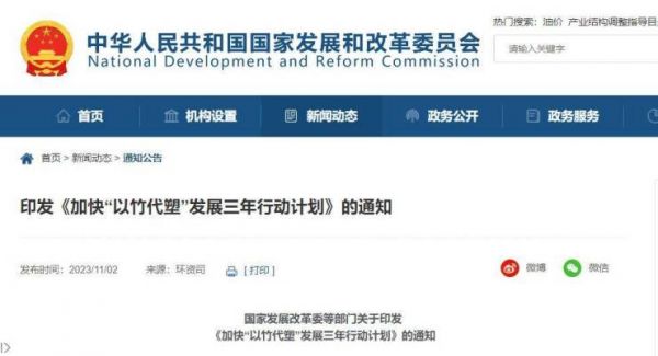 11月6日,国家发改委发布消息,根据2日由国家发展改革委工信部、财政部、国家林草局四部门印发的《加快“以竹代塑”发展三年行动计划》(以下简称《行动计划》)做出解读。
