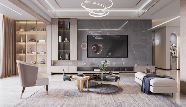 【吕耀文】:业主在日常生活中偏好简约的风格,而灰色会赋予空间沉稳大气之感,为此在设计时我们将客厅的主色调定为灰色,灰色系的背景石材与富有质感的沙发、传统直线吊顶与简约墙面,在彼此呼应中凸显细节之美。在结构与形式上,在墙面选用木饰面和潘多拉岩板,互相衬托的同时打造层叠递进的视觉效果,彰显空间的格调与质感。而在玄关处,爵士白端景墙将玄关二字尽显出来,玄而又玄,悬而未绝。