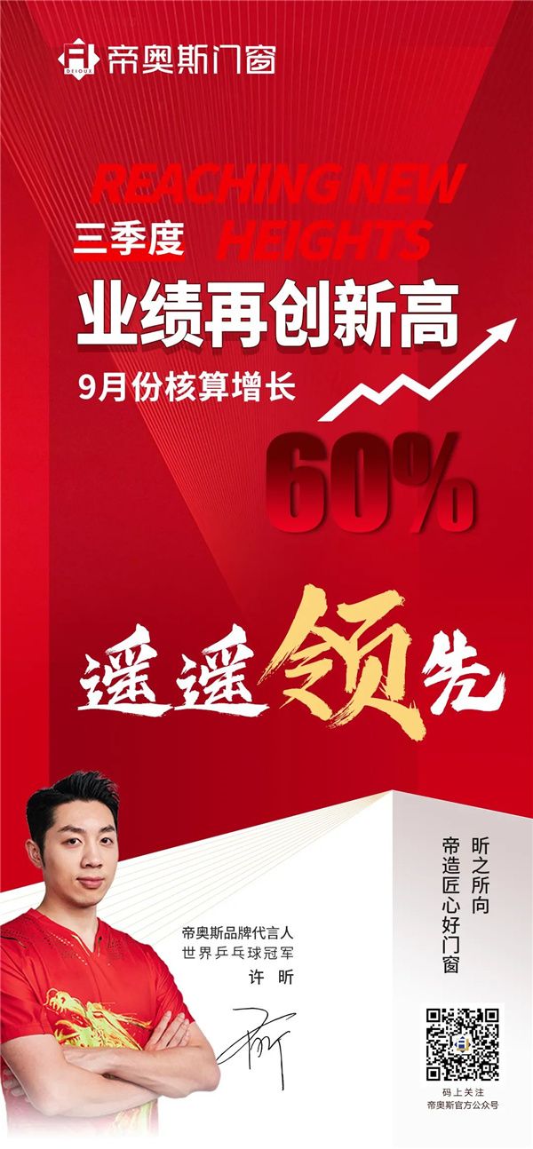 品牌形象全新升级给帝奥斯门窗带来了市场口碑和销量的双重增长,产品增值和文化价值得到了大大的提升;特别是乒乓球世界冠军许昕为品牌注入了“冠军、拼搏、活力”的形象基因,吸引更多年轻人喜欢和选择帝奥斯门窗,极大的赋能终端市场竞争力提升。