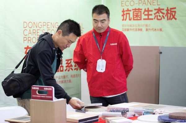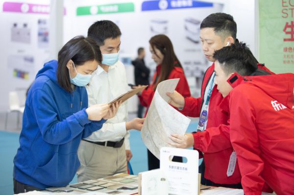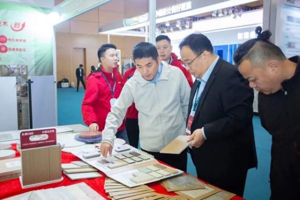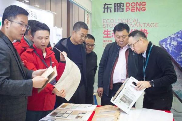 △河北省学会理事长刘炳辉莅临展位现场,对东鹏软瓷、生态石、医疗生态板等产品表示赞赏。