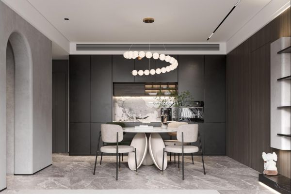 这是一套现代极简风格暗色调的住宅,业主追求时尚与炫酷的空间气质。我们大胆的尝试了大面积的深色系去串联整个空间,灰色的墙面搭配深棕色实木护墙板结合形成空间的主色调。为了保持空间的灵动性避免过于压抑,我的软装搭配会比较活泼,拉丝黄铜的白色珍珠项链灯,花瓣形状的桌腿,还有一些潘多拉石材与蘑菇石的点缀,使整个空间沉稳而又俏皮。