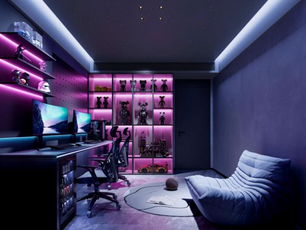 同时我们深入了解到两位业主的生活习惯,非常依赖于电脑手机的使用。我们与业主一拍即合,将未来的宝宝房暂时打造为电竞房使用,打造一个二人的小天地,因为都是活动家具,后期更换成为宝宝房也十分方便。
