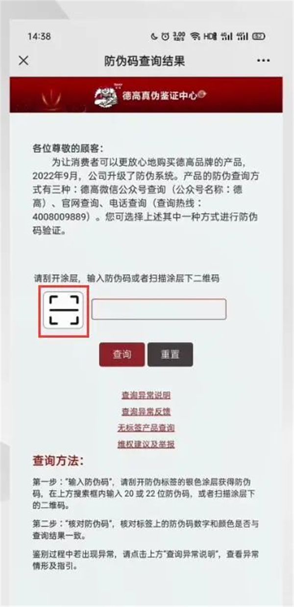 在公众号防伪查询页面里输入防伪码,进行查询。