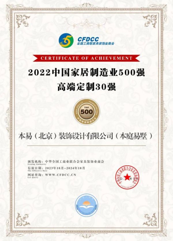 BꓛTꓛNN本庭易墅凭借对家居空间的系统设计、高效利用,充分满足消费者的舒适、时尚、个性消费需要等专业优势,荣获高端定制30强认证。