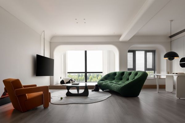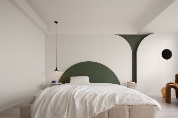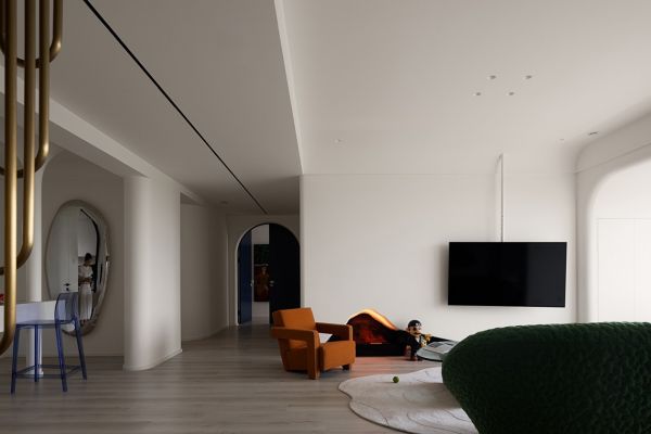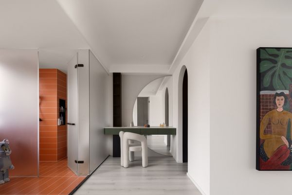 【李超】:在与业主的沟通过程中,了解到业主想要一个干净舒适,同时又不失设计感的家。选用低饱和的颜色能让空间更为干净柔和,让业主在一天的疲惫工作后能快速放松下来。但大面积的白色会较为单调,因此选用一些明亮的颜色作为点缀,能够吸引观者的注意力,为整个家增添亮点。