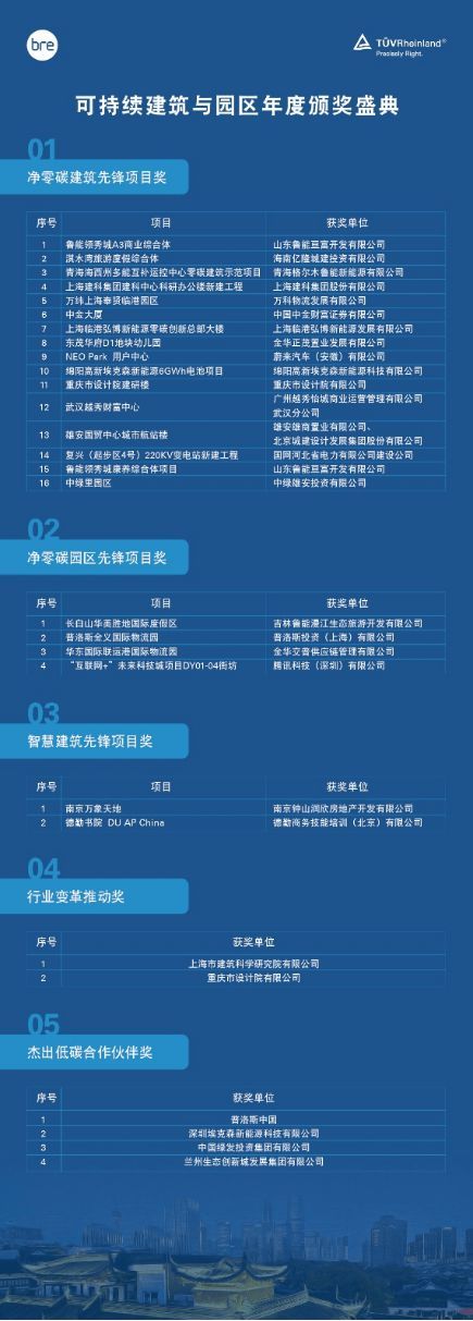 盛典上,TÜV莱茵与BRE为22个净零碳建筑、净零碳园区、智慧建筑先锋项目,以及6家积极推动行业变革的低碳合作伙伴颁发了奖项,以表彰其在可持续建筑和园区领域取得的卓越成就。