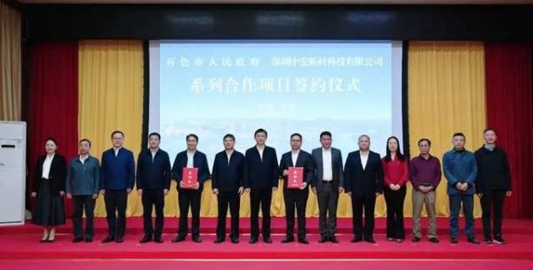 11月22日,百色市人民政府与深圳中宏新材科技有限公司系列合作项目签约仪式在百色市市委礼堂举行。市委书记黄汝生先生出席签约仪式并见证签约,深圳中宏新材科技有限公司董事长金昔跃,市委常委、副市长李玉成代表双方签约。