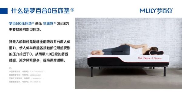 作为0压床垫的开创者,MLILY梦百合是国内先行提出0压概念的品牌,秉持着对创新的热情,以“提升人类的深度睡眠”为使命,10余年来专注于0压绵的研究和测试,并获得四国专利,确保我们创造出的每一个产品都能使用户享受舒服的0压睡眠。