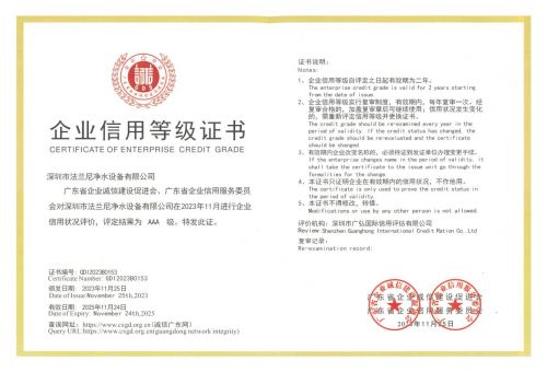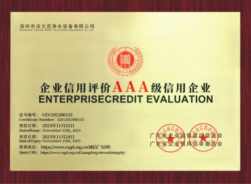 恪诚守真,匠心精筑!法兰尼自成立以来,始终坚持“诚信为本,质量永恒”的企业宗旨,并视为企业的立身之本和经营之道,法兰尼不断加强诚信体系建设,除了连续三次蝉联“企业信用评价AAA级信用企业”,在其他诚信领域也颇有建树,如“广东省守合同重信用企业”、“全国产品和服务质量诚信示范企业”、“全国质量诚信先进企业”等。未来,法兰尼将再接再厉,一如既往地强化诚信经商、践行守诺的信用意识,完善企业信用体系建设,践行企业责任与担当,为打造卓越净水品牌而不懈奋斗!
