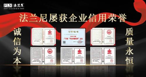 法兰尼连续三次蝉联“企业信用评价AAA级信用企业”,其企业信用等级评定均为“AAA级”最高评级,信用提示“信用优良”,释义“公司信用管理基础完善,信用能力强,诚信度高,发展趋势乐观,综合能力处于行业领先水平”,获得该评级意味着法兰尼企业具有最高的信用记录,经营状况最佳,债务风险小,发展前景广。