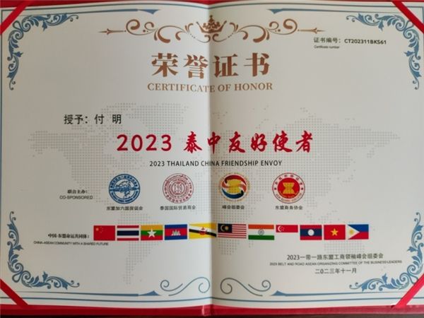 本次峰会,赫丝门窗斩获多项荣誉,赫丝门窗中国董事长--付明先生被评为“2023年泰中友好使者”,泰国副总理兼国防部长兼陆军总司令--侧他上将亲自为付明先生颁发“2023年泰中友好使者”荣誉证书。