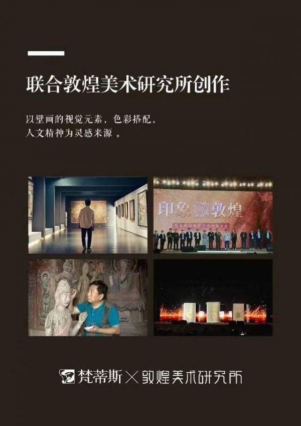 今年5月,梵蒂斯合作敦煌美术研究所推出”印象敦煌“系列,以敦煌壁画艺术和丝路精神为创作起点,从中提取视觉元素以及色彩,将人文、艺术、匠心完美融合。