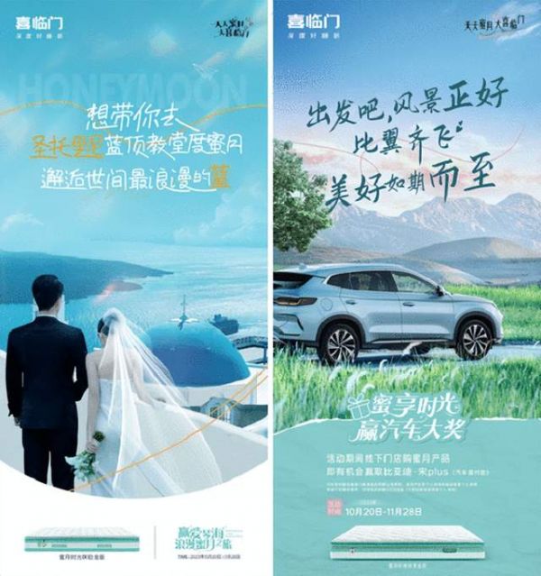 将蜜月文化概念植入消费者心智是初步动作,为进一步促进用户实现天天蜜月的美好家居生活,喜临门还推出了多种产品福利政策,在10月20日-11月28日的蜜月喜临门第九季活动期间,前往线下门店购喜临门产品满29800元,即有机会赢取希腊爱琴海双人豪华蜜月游,或是在线下门店购买蜜月产品,有机会赢取比亚迪宋plus(汽车首付款)。可以说,这一举措成功地抓住了当前消费者心扉,吸引了一批又一批的“自来水”前往门店消费购买喜临门产品,无论是对于销量的增长还是品牌IP的传播都起到了很大的作用。
