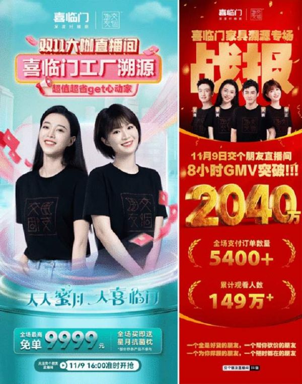 抖音本地生活直播在当前环境下,无疑是一种全新的尝试,本地团购的形式能够链接线上线下同时赋能合作伙伴,对品牌来说,它自然是一个不可错过的营销机会与渠道。11月9日,喜临门携手交个朋友,以工厂溯源的惊喜价格及全场最高免单9999元的超值福利吸引了149w+的消费者前来观看,并在两位好物官的热情讲解与多轮福利的吸引下,最后成交的GMV达2439.4万!这样的好成绩,不仅对于喜临门与交个朋友直播间来说可谓是双赢,也在抖音本地生活直播的玩法应用和结果的实现上为家居行业树立了标杆。通过这场直播,提高了产品曝光度、品牌知名度、订单转化率,也通过蜜月生活家居场景的打造,为用户勾勒出了美好家居生活的理想模样,为接下来进一步输出“天天蜜月,大喜临门”的品牌理念奠定了坚实的基石。
