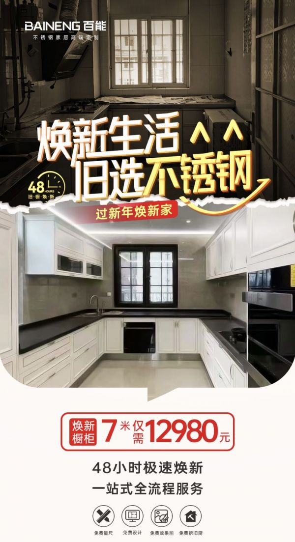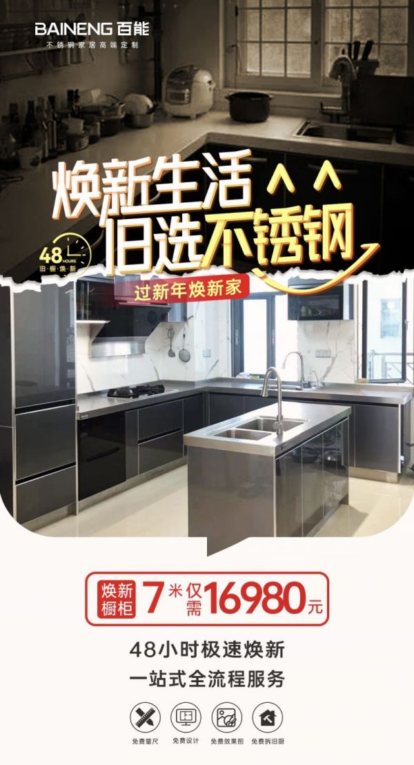 2023年11月25日,百能家居发起旧厨焕新活动,该活动是不锈钢家居行业首个以旧厨改造为主题的活动,旨在为客户解决旧厨房常见的痛点问题,为人们带来高品质的家居生活。