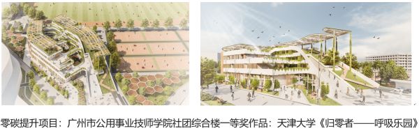 评审组专家一致认为,两个一等奖作品都将建筑设计的低碳化和绿色化进行了良好的结合。其中,《风·井园》建筑形体规整,屋面向南侧倾斜,压缩室内用能空间、增加了光伏的可利用面积,面向湖的一侧设计了高效的公共交通体系,在内部空间穿插了多个冷巷,形成了丰富有趣的空间,同时引导了自然通风。《归零者——呼吸乐园》则保持了建筑本体原有的完整性,利用垂直绿化实现建筑的被动降温。屋面光伏系统对原有屋面的绿化和交通不产生影响,并生成连续、舒适的遮阴廊道。两个建筑之间的交通流线加强了两个形体之间的联系,增加了空间的趣味性。