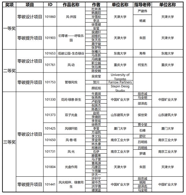 据介绍,本届竞赛共吸引700余组团队报名,提交有效作品210件。经过由崔愷院士领衔、国内外学术专家组成的评审专家组多轮评审,最终评选出一等奖2项、二等奖3项、三等奖7项、优秀奖20项、入围奖30项。其中,获得一等奖的作品《归零者——呼吸乐园》、《风 · 井园》均来自天津大学。