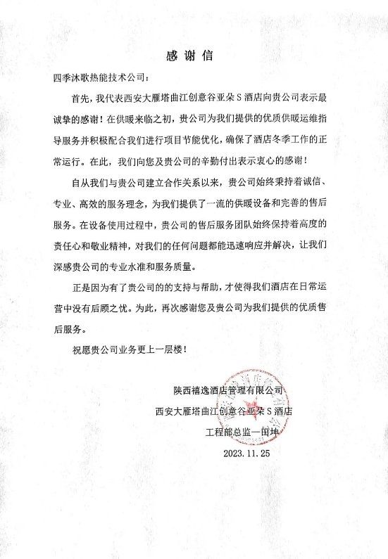 近日,四季沐歌收到了来自西安大雁塔曲江创意谷亚朵S酒店的感谢信,感谢四季沐歌在今年供暖季来临所提供的优质供暖运维指导服务并积极配合项目节能优化,同时对于四季沐歌空气能供暖设备表示了高度认可。