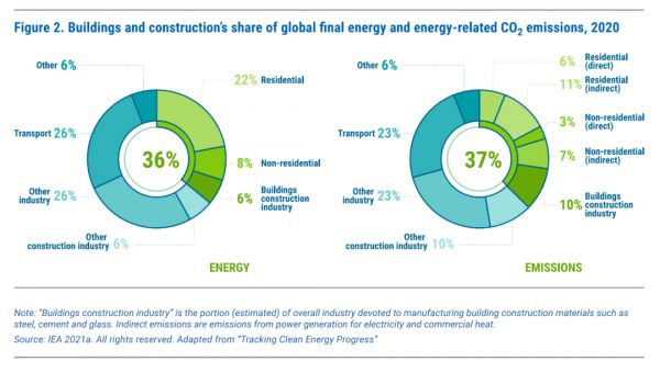 数据显示,建筑物全生命周期消耗了全球约40%的能源,并排放了全球二分之一以上的温室气体。其中2020年全球建筑运行能耗约占社会总能耗的36%,二氧化碳排放占总排放的37%。