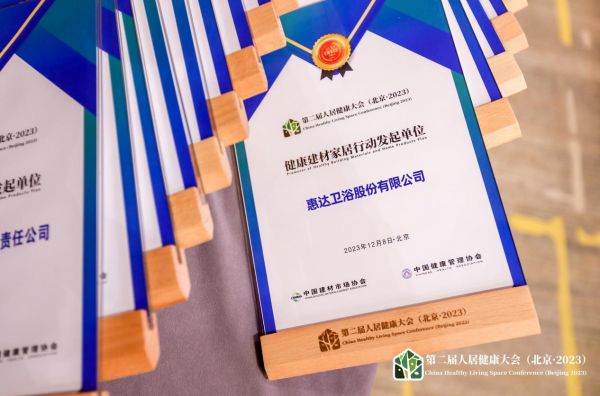 随后,备受关注的《健康建材家居通则》正式发布,惠达卫浴作为这一通则的核心参与编写单位,获得了主办方的认可和荣誉证书。此外,鉴于惠达卫浴在推动绿色发展、坚持质量管理、打造品牌影响力等方面的出色表现,大会特别向惠达卫浴授予“健康建材家居行动发起单位”称号,以表彰其在行业内的贡献和领导地位。