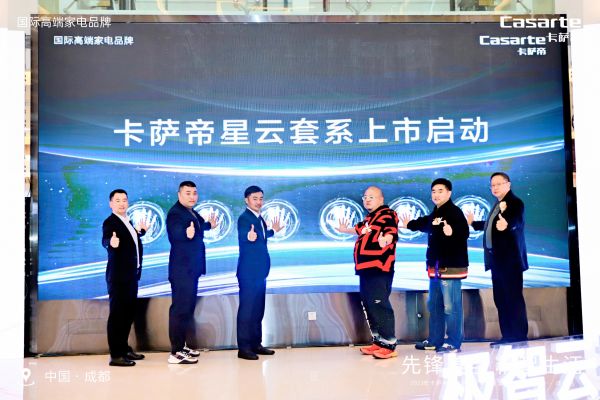 在完成星云套系发布后,富森美家居建材市场总经理熊维、四川室内装饰协会设计专委会会长周海、海尔智家四川分公司营销总经理张林、成都富海智慧家科技有限公司总经理赵斌、北富军团联盟会长陈陶等嘉宾上台,共同开启卡萨帝星云套系产品上市。