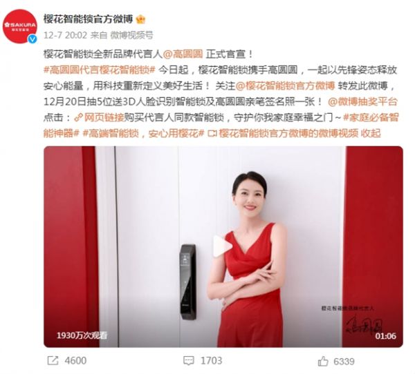 对于此次合作樱花表示:“作为家居安防的第一道关卡,智能门锁行业近几年来发展迅猛,未来,我们将携手品牌代言人高圆圆一起以先锋姿态释放安心能量,持续为更多家庭带去高品质生活,助力行业高质量发展。”高圆圆在微博中也亲自回应道:“很开心成为樱花智能锁品牌代言人!期待和樱花一起,锁定安心力量,触发品质生活的更多可能。”
