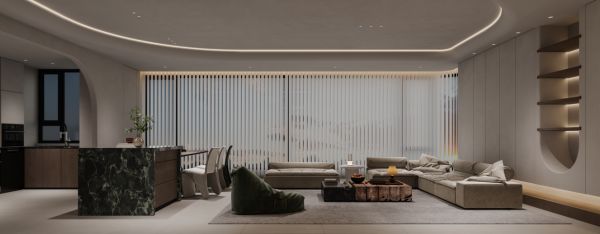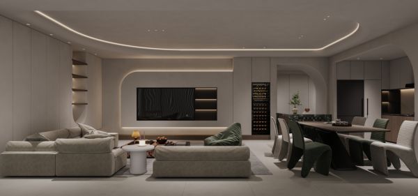 以胡俊曾经参与设计的《新希望天府锦麟壹品》为例,彼时用户期望最终的人居空间可以呈现一个拥有自然、艺术穿插在一起的舒适体验, 胡俊运用自然材料,让空间亲近自然,让用户回归自然,通过光线、空气、阳光的引入,构成室内空间与自然的交融,为空间润色,从传统的二维感官空间走入五维的多元感官体验,运用科技力量提供上乘、便捷、贴心、舒适的智能应用,以精神层面的升华为载体,创造出空间里艺术美学气质的传达与触碰。